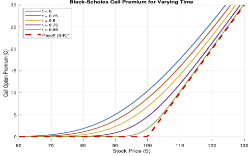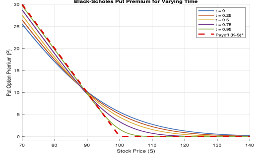 The Black-Scholes put price for varying time is depicted in the following figure.