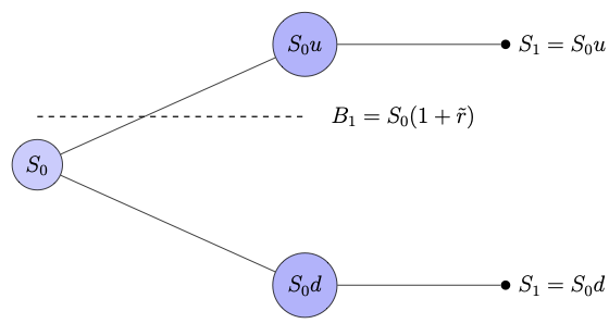 The above figure illustrates one-step binomial model, where a discretely compounded risk-free interest scheme is considered.